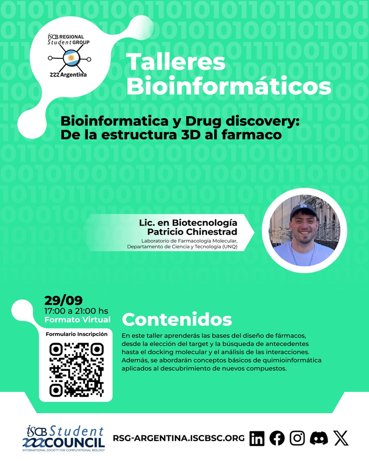 En este taller, a cargo del Lic. en Biotecnología Patricio Chinestrad, aprenderás las bases del diseño de fármacos, desde la elección del target y la búsqueda de antecedentes hasta el docking molecular y el análisis de las interacciones. Además, se abordarán conceptos básicos de quimioinformática aplicados al descubrimiento de nuevos compuestos.