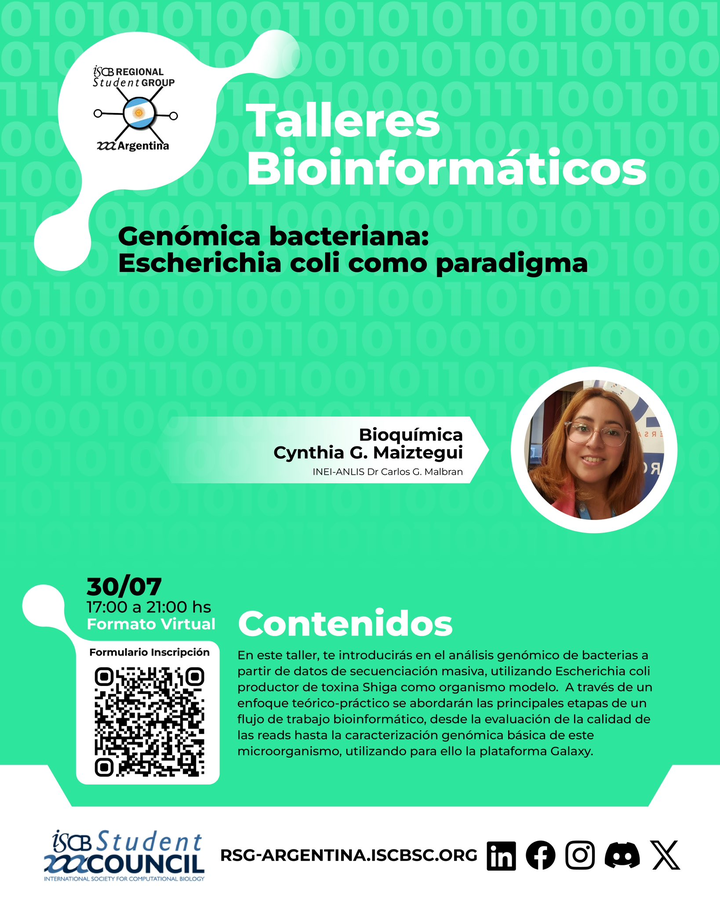 En este taller, a cargo de la Bioquímica Cynthia G. Maiztegui, te introducirás en el análisis genómico de bacterias a partir de datos de secuenciación masiva, utilizando Escherichia coli productor de toxina Shiga como organismo modelo. A través de un enfoque teórico-práctico se abordarán las principales etapas de un flujo de trabajo bioinformático, desde la evaluación de la calidad de las reads hasta la caracterización genómica básica de este microorganismo, utilizando para ello la plataforma Galaxy.