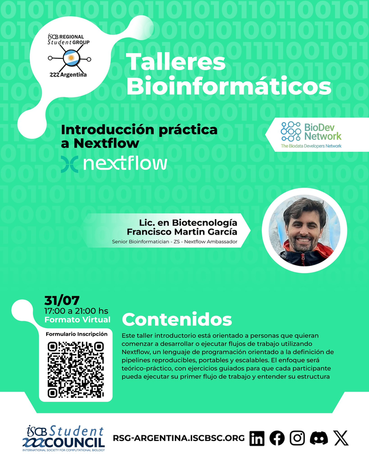 Este taller introductorio, a cargo de Francisco Martin García, está orientado a personas que quieran comenzar a desarrollar o ejecutar flujos de trabajo utilizando Nextflow, un lenguaje de programación orientado a la definición de pipelines reproducibles, portables y escalables. Durante el encuentro se abordarán los siguientes temas: